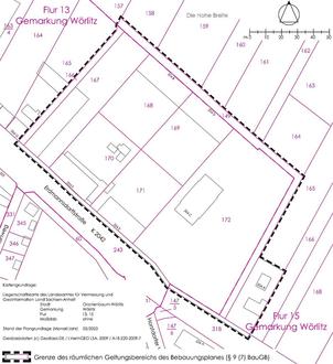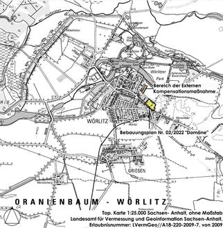 Die Lage des Geltungsbereiches des Bebauungsplanes Nr. 02/2022 "Domäne" der Stadt Oranienbaum-Wörlitz ist auf dem nachfolgend abgedruckten Katenausschnitt ersichtlich.