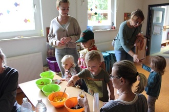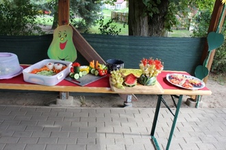 Höhepunkt des Festes war der Übergang zwischen den zwei Modulen. Als Abschluss vom „Seelischen Wohlbefinden“ haben die Kinder zum Lied „Der Zauberer hat Hexenschuss“ ihre Eltern massiert und wieder fit gemacht. Danach ging die Reise los: Mit dem sogenannten Drachenzug und natürlich dem Jolinchen ging es auf ins „Gesund-und-lecker-Land“. Dort werden wir uns in diesem Kitajahr mit dem Thema „Gesunde Ernährung“ beschäftigen. Für unseren Verpflegungsstand hatten unsere Eltern bereits viele gesunde Alternativen in Form von Obst-und Gemüseplatten, gesunden Kuchen, Muffins und Schnittchen gezaubert. Dafür an dieser Stelle nochmal ein großes Dankeschön!