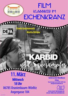 Zu sehen ist dieses Mal die DEFA-Komödie von 1963: „Karbid und Sauerampfer“ mit Erwin Geschonneck und Marita Böhme. Die Filmkritik schrieb damals: „Erster Versuch der DEFA, Lebensumstände und Alltagsschwierigkeiten unmittelbar nach Kriegsende aus heiterer Perspektive darzustellen. Das Ergebnis ist eine der besten deutschen Filmkomödien, die, auf einem mit Pointen gespickten Drehbuch beruhend, mit einem souverän-überzeugenden Hauptdarsteller aufwarten kann.“