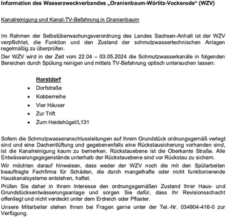 Der WZV wird in der Zeit vom 22.04 – 03.05.2024 die Schmutzwasserkanäle in folgenden Bereichen durch Spülung reinigen und mittels TV-Befahrung optisch untersuchen lassen: