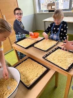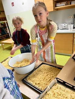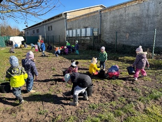 Die Osterferien sind das Highlight im Monat April. Die Kinder haben sich viel vorgenommen, so stehen ein Kino-Tag mit Popcorn (an unserem neuen Smartboard), Osterbasteleien, ein Sporttag mit Soccer court, Waffelbäckerei oder Obstsalat herstellen auf dem Programm. Und nebenbei bei dem schönen Wetter wird unser Acker flott gemacht für die neue Ernte. Es kommen zunächst Kartoffeln, Radieschen, Salat und Mohrrüben in die Erde. Dafür muss der Boden vorbereitet werden, auch dabei helfen die Kinder – groß und klein.