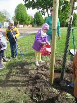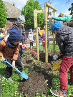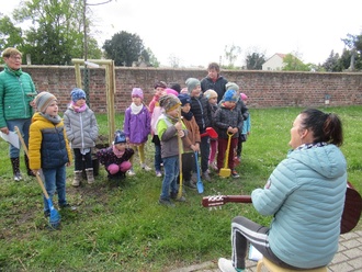 Im Monat April gab es eine Baumpflanzung in Wörlitz, zu der wir unser wunderschönes Lied vom Baum gesungen haben. In dem Lied geht es um aktuelle Probleme in unserer Natur, der Baum erzählt, dass es ihm nicht so gut geht. Er erzählt aber auch, dass wir Menschen der Natur helfen können. Die Pflegepatenschaft für diese Linde übernahm Herr Weber, der von uns noch eine Urkunde erhalten wird, weil wir das toll finden, wenn sich jemand um den Baum kümmert. Denn das Bäumchen liegt uns am Herzen. Außerdem waren mehrere Vertreter der örtlichen Politik anwesend.