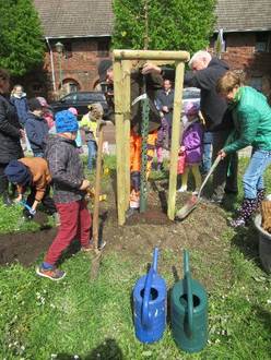 Wir haben den Spatenstich begleitet und das Pflanzloch mit Erde gefüllt. Danach wurde angegossen, damit sich das Bäumchen schnell und fest verwurzelt und an der Erde festhält. So heißt es auch in unserem Lied: „Wenn du vorbeigehst, grüß mich mal, und wenn es trocken ist, gieß mich mal! … “ (Text und Musik von Margarete Jehn).