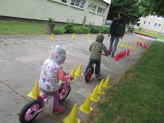 Im Spiel probieren wir uns mit verschiedenen Fahrzeugen, wie: Laufrad, Dreirad, Roller und Fahrrad aus. Als Geschicklichkeit im Slalom, über unseren großen Rollerberg oder einfach nur Geradeaus.