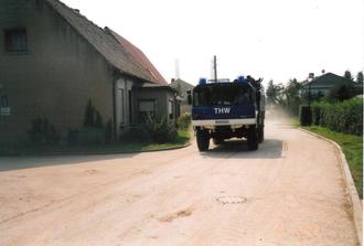 * THW Einsatzfahrzeug in voller Fahrt zum Wall (Hafen Vockerode)