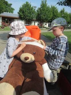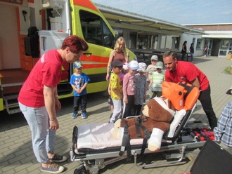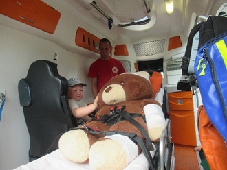 Am Rettungswagen mussten die Kinder den Riesenteddy Henry verarzten. Er lag auf der Transportliege und musste verbunden werden und eine Spritze gegen die Schmerzen bekommen. Mit einem „Hau-Ruck“ wurde die Liege in den Rettungswagen geschoben und Henry wurde von den Kindern beruhigt und getröstet. Wir erfuhren eine Menge über Erstversorgung und Verhalten im Notfall.