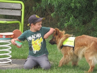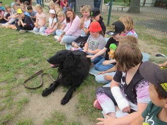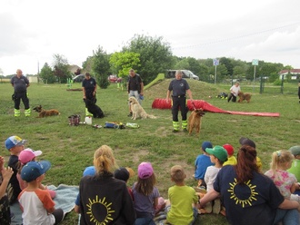 Doch unser Jubiläumsmittwoch war noch nicht vorbei!! Gegen 15 Uhr erwarteten wir die an die Feuerwehr Vockerode angegliederte Hundestaffel. Diese Hunde können Menschen retten, die vermisst werden oder in Not geraten sind. Aufmerksam lauschten wir den Erklärungen und Vorführungen. Es dauert lange, bis die Hunde ihre Ausbildung beendet haben und das Engagement der Besitzer ist ehrenamtlich! Dies verdient unseren Respekt. Wir durften selbst Dinge ausprobieren und die Hunde streicheln bzw. Leckerli geben. An alle Hundebesitzer und Hunde, die sich Zeit genommen haben, ein besonders großes Dankeschön!