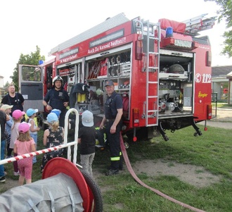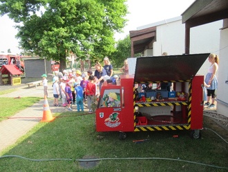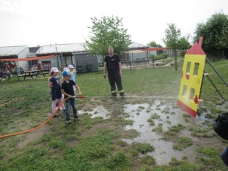 Welches Kind ist nicht begeistert von einer Feuerwehr und der Ausrüstung eines Feuerwehrmannes? Das wurde heute genau unter die Lupe genommen. Die funktionelle Minifeuerwehr (Eigenkonstruktion der Oranienbaumer Kameraden-super!) ließ die Kinderaugen strahlen. Wir durften Hohlstrahlrohre bedienen und damit auf einen Büchsenturm zielen, der mit lautem Knall umfiel! Außerdem haben wir auf eine Brandhaus-Attrappe gezielt, um ein Feuer zu löschen. Gar nicht so leicht, den Schlauch zu halten! An der großen Feuerwehr erklärten uns die Kameraden viele interessante Dinge zur Ausrüstung und zum Equipment. Wir staunten über das Gewicht der Atemschutzflaschen und Helme, testeten ein Funkgerät durften sogar im Auto sitzen! Das war so hoch, dass wir beim Aussteigen aufpassen mussten. Einige durften sogar das Lenkrad anfassen!!