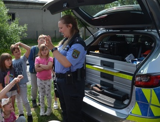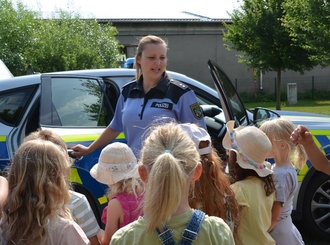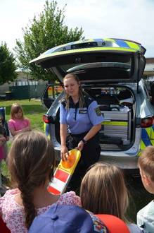 Eine ebenso gut besuchte wie interessante Station war natürlich das Polizeiauto! Die junge Polizistin erklärte uns geduldig und kindgemäß alles, was wir wissen wollten. Und wir wollten wirklich ALLES wissen! Sie hatte auf jede Frage eine Antwort.