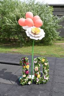 Augen auf und aus dem Bett gesprungen!! Das „Geburtstagskind Kita“ ist bereits mit meterlangen selbst genähten Wimpelketten und Luftballons geschmückt und erwartet heute viele Gäste! Eine aus Efeu und Blumen gesteckte 10 schmückt den Eingang.