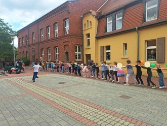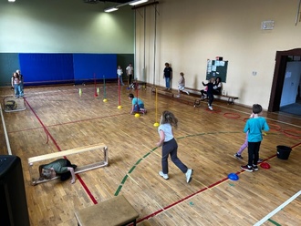 Spielegarten aufgebaut werden sollte. Das mussten wir ein paar Stunden verschieben, denn erst am Nachmittag sollte die Sonne sich zeigen. Während die Schulkinder sich nach ihrem gemeinsamen Klassenfrühstück vorerst in ihrer Turnhalle an einem Bewegungsparcours messen, bereiteten die Kleinen ihr Programm für die Gäste vor; bis die Sonne und der Wind die Regenwolke endlich wegschieben konnten.