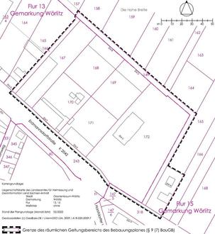 Die den Bebauungsplan bestreffenden Flurstücke sind bezeichnet mit Flurstück 166, 167, 168, 169, 170, 171, 172, Flur 13 sowie Teile des Flurstücks 243, Flur 13 und Teile der Flurstücke 318 und 165 sowie das Flurstück 149, Flur 15, alle Gemarkung Wörlitz. Die Flurstücksteile des Flurstück 243 und 318 sind Bestandteile der Erdmannsdorffstraße und damit für die gesicherte Erschließung des Vorhabenstandortes erforderlich.