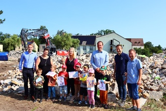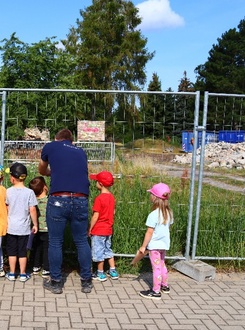 Am 25.07.2024 gegen 10 Uhr versammelten sich einige Kinder aus Oranienbaum mit einigen Gästen an der Leopoldstraße 10 A. Wir schauten uns die vorangegangenen Abrissarbeiten unserer ehemaligen Kita an. Von weitem schauten wir uns die Berge von Steinen an, die vorher unser Kindergarten war.