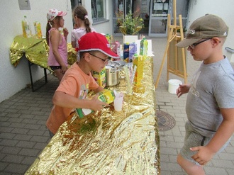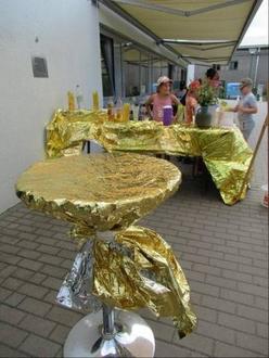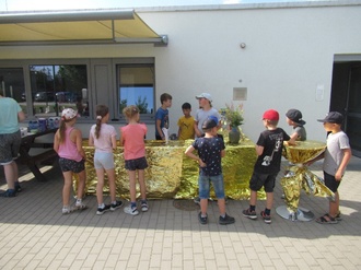 Gemeinsam planen und überlegen wir uns Aktivitäten für die kommenden Wochen. Aber die schönsten Dinge sind die, die spontan entstehen! Zum Beispiel haben sich die Kinder aus unseren blauen Kisten in der BeBau (Bewegungsbaustelle) eine „Bar“ gebaut. Einige schenkten Getränke aus, andere bauten Bartische aus den Kisten und anschließend musste man sich einen Drink kaufen. In dieser Idee steckte unsere erste große gemeinsame Aktion. Wir bauten eine echte Bar auf! Mit goldenen Rettungsdecken entstand ein Stehtisch und eine futuristische Bar. Die Kinder entwarfen selbst Getränkekompositionen, die sich sehen lassen konnten! Auf jeden Becher kam noch eine gefrorene Weintraube (sehr lecker!!) oder ein Stück Limette. Jeder Drink bekam einen Namen. Es wurden Getränkekarten entworfen. Die Schlange der anstehenden durstigen Gäste wurde immer länger und es wurden auch Erzieher darunter entdeckt!