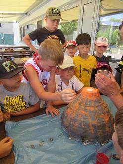 Ein Projekt über mehrere Tage war auch unser „Vulkan“. Zuerst mussten wir mit Gipsbinden einen haltbaren Vulkan herstellen und nach dem Trocknen bemalen. Dann haben wir den Vulkanausbruch mit unterschiedlichen Materialien simuliert! Das Beeindruckendste war der Vulkan aus einer Colaflasche und Mentos! Die Fontäne schoss über 2 Meter hoch!!