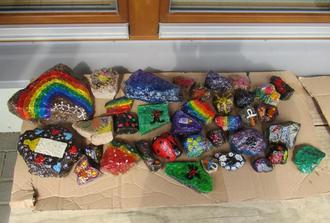 Ebenfalls spontan ergab sich der Wunsch, Steine zu sammeln. Wir wollen in unserem Acker die Beetpflege an alle Gruppen verteilen, damit die Verantwortlichkeit der Gruppen übersichtlicher wird. Jede Gruppe soll dann einen speziell bemalten Stein am Beet haben. Gesagt, getan. Wir liefen los mit dem Bollerwagen und suchten Steine jeder Größe. Das Ergebnis kann sich sehen lassen: