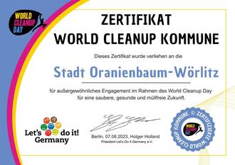 Dieses Zertifikat wurde verliehen an die Stadt Oranienbaum-Wörlitz für außergewöhnliches Engagement im Rahmen des World Cleanup Day für eine saubere, gesunde und müllfreie Zukunft.