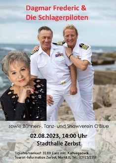 Hochkarätige Stars werden zum traditionellen Seniorennachmittag anlässlich des Zerbster Heimat- und Schützenfestes am Mittwoch, dem 2. August, auf der Bühne der Stadthalle stehen. Dabei ist die DDR-Showlegende Dagmar Frederic. Wer die Entertainerin schon einmal in ihren Programmen erleben konnte, wird diese vielseitige und stimmgewaltige Powerfrau nicht so schnell vergessen. Sie besticht in ihren Auftritten mit Schlagfertigkeit, Anmut, Eleganz und Bühnenpräsenz. Mit ihrem umfangreichen Repertoire bedient diese „Show Lady“ musikalische Wünsche in jeder Hinsicht.