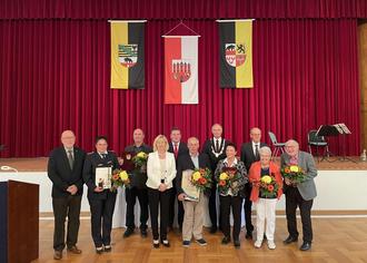 Die Unbezahlbarkeit ehrenamtlichen Engagements für die Stadt würdigte Bürgermeister Andreas Dittmann (SPD, 5. v. r.) am 3. Oktober in der Zerbster Stadthalle. Zum dritten Mal wurden in einer Festveranstaltung am Tag der deutschen Einheit Bürgerinnen und Bürger ausgezeichnet, die sich dabei in besonderer Weise verdient gemacht haben. Die Verdienstmedaille der Stadt Zerbst/Anhalt erhielten Karin Spott und Wolfgang König (2. v. r. und r.). Der Ehrenamtspreis des Stadtrates 2023 ging an Erika Reifarth, Reinhard Werner (4. und 3. v. r.) und Holger Lüdicke (3. v. l.). Mandy Schröter (2. v. l.) wurde der Ehrenstern des Landesfeuerwehrverbandes e. V. in Bronze verliehen. Hans Wink (vorn Mitte) wurde zum Ehrenwasserwehrleiter der Stadt Zerbst/Anhalt ernannt. Mit auf dem Foto: Stadtratsvorsitzender Wilfried Bustro (CDU, l.) sowie die Laudatoren Silke Hövelmann und Philipp Koch.