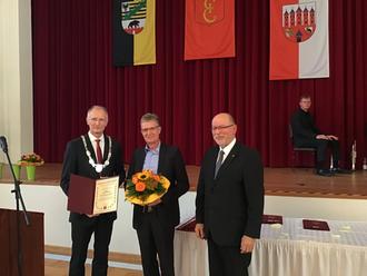 Uwe Hünecke (Mitte) erhielt den Ehrenamtspreis der Stadt Zerbst/Anhalt aus den Händen von Bürgermeister Andreas Dittmann und vom Stadtratsvorsitzenden Wilfried Bustro. Foto: Toni Voigt