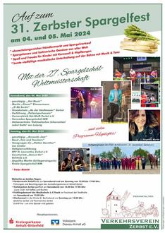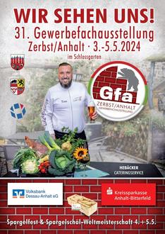Ein ereignisreiches Wochenende steht den Besucherinnen und Besuchern am Wochenende vom 3. bis 5. Mai 2024 vor. Die Gewerbefachausstellung und das vom Zerbster Verkehrsverein ausgerichtete Spargelfest mit der Spargelschäl-Weltmeisterschaft finden in diesem Jahr zum 31. Mal statt. Hinzukommen diverse Konzerte sowie der Elbe-Radeltag.