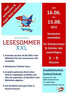 In diesem Jahr startet mit Beginn der Sommerferien in Sachsen-Anhalt wieder die große Sommerferienleseaktion der öffentlichen Bibliotheken. In Zusammenarbeit mit den Schulen des Landes, dem Landesverwaltungsamt und dem Land Sachsen-Anhalt steht der nunmehr 16. Lesesommer XXL in den Startlöchern.
