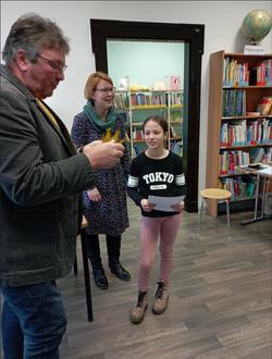 Bernd Adolph und Martina Linke überreichen Matilda Ernst die Lesekrone. ⇔ Foto: Nik Pfeifer