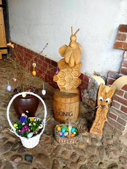 Liebevoll im hofeigenen Laden arrangierte regionale Produkte wie unter anderem Rüben- oder Apfelsaft, verschiedene Honigsorten und selbstgestrickte Osterdeko, herrlich duftendes frisches Brot aus dem hofeigenen Holzbackofen, von Andi höchstpersönlich gebackener Kuchen in den unterschiedlichsten Sorten und ein Grillstand für den herzhaften Gaumengenuss. Mit diesem kleinen, aber feinen Angebot lud Andreas Schultz - gelernter Tischlermeister, Restaurator und darüber hinaus leidenschaftlicher Imker (daher neben dem berufsbedingten klassischen “Holzwurm” auch sein weiterer Spitzname “Bienen-Andi”) - am 31.03.2023 zu seinem zweiten gemütlichen, hübsch dekorierten Ostermarkt ein. Fernab von überbordender Reizüberflutung in einer ländlich angehauchten Idylle. Ob Mama, Papa, Tante, Onkel und Freunde der Familie - alle halfen mit und so entstand gleich ein angenehmes Willkommensein-Gefühl.