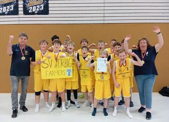 Die namhaften Mannschaften aus Halle, Magdeburg, Sandersdorf und Weißenfels fanden einfach kein Rezept, um unsere kleinen Farmers auch nur einmal zu schlagen. So wurden wir vorfristig als U12 zum Landesmeister gekürt. Beim letzten Punktspiel in Sandersdorf sollte die „weiße Weste“ natürlich unbefleckt bleiben. Also musste noch ein letzter Sieg her. Da Zahlen im Basketball mitunter fast etwas Magisches an sich haben, liebäugelten die Gäste nicht nur mit dem Gewinn des Spieles, sondern auch mit dem 1.000-ten Saisonpunkt. Beides wurde zuverlässig erreicht. Die Zörbiger legten nach 10 Spielen eine beeindruckende Bilanz mit 1.040 : 454 Punkten vor.