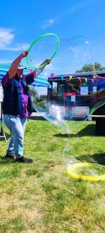 Schon am Nachmittag wurde ein buntes Programm für Kinder und Familien geboten: Kirschkernweitspucken, Eierlaufen, fröhliche Wasserschlachten, Wurfspiele und viele andere Aktivitäten sorgten für Freude und Bewegung. Besonders viel Aufmerksamkeit zog der Seifenblasenkünstler auf sich. Mit seinen riesigen, schillernden Seifenblasen begeisterte er Groß und Klein. Viele probierten selbst aus, was mit Seifenlauge und etwas Geschick möglich ist.