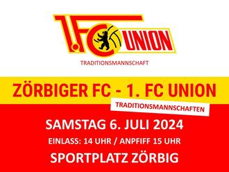 Im Rahmen von Zörbig Tanzt 2024 lädt der ZFC 1907 e.V. alle Fußballfans sowie Freunde und Familien zum Spiel der Traditionsmannschaften des Zörbiger FC gegen den 1. FC Union Berlin am Samstag, dem 06.07.2024 ein. Anstoß auf dem Zörbiger Sportplatz ist 15 Uhr, der Einlass (Eintritt: 5 Euro) erfolgt ab 14 Uhr.