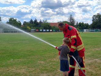 Natürlich spielte das Kommando „Wasser marsch!“ ebenfalls eine Rolle. Jeder durfte mal mit der Kübelspritze pumpen und den Wasserstrahl auf ein kleines Ziel richten. Vor allem das Pumpen war ganz schön anstrengend! Und wie so oft: Das Beste zum Schluss. Alle Kinder durften bei sommerlichen Temperaturen einmal durch den großen Wasserstrahl flitzen.
