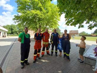 Die Kameraden Martin Kaufmann und Lucas Wimmer von der Löberitzer Feuerwehr sowie Tobias Ortel, Michael Hönicke und die Kameradin Christin Stoye von der Feuerwehr Fuhnetal hatten sich extra Urlaub genommen oder kamen in ihrer freien Zeit nach der Nachtschicht, um die Erstklässler für die Feuerwehr zu begeistern und ihnen einen Einblick in die verantwortungsvolle Tätigkeit zu geben. Dafür hatten sie sich einiges überlegt: