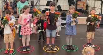 14.45 Uhr auf dem Festplatz am Festzelt. Um 15.00 Uhr ging es los! Wie aufregend war es für die Kinder, auf so einer großen Bühne zu stehen! Sogleich startete das Programm: mit viel Freude sangen und tanzten die Kinder.