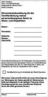 für die Veröffentlichung von Altersjubiläen (ab dem 70. Geburtstag alle 5 Jahre) und den Ehejubiläen (ab dem 50. Ehejubiläum alle 5 Jahre) in den Zwenkauer Nachrichten sowie der Leipziger Volkszeitung benötigt die Pass- und Meldebehörde eine Einwilligung für die Weitergabe der benötigten personenbezogenen Daten.