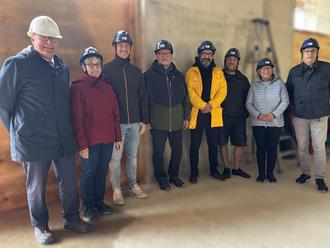 Auch die Stadträte der Stadt Zwenkau überzeugten sich beim Deckenfest in der Kita Harthweide vom Baufortschritt. V.l.n.r.: Bürgermeister Holger Schulz mit Simone Sauder, Robert Kratz, Frank Jahr, Mirko Grimm, Steffen Wieser, Helga Mészáros und Harald Redepenning.