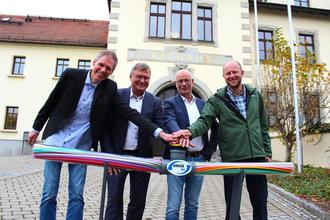 Bürgermeister Holger Schulz bei der symbolischen Inbetriebnahme gemeinsam mit enviaTel-Geschäftsführer Haiko Rennert (2. v. rechts), dem Breitbandkoordinator des Landkreises Leipzig Jörg Martin (links) und dem Projektleiter der DeNe Deutsche Netzbau Krystof Odrobka (rechts). Bildrechte: enviaM-Gruppe