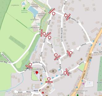 Die Veranstaltungsfläche des Martinsfestes (Aufstellung, Start und Ziel für Lampionumzug, Imbiss & Getränkestände, kleine Feuerstellen) befindet sich vor der Laurentiuskirche, auf der Straße „Mühlberg“ sowie dem Rathausvorplatz. Die Parkflächen um die Laurentiuskirche herum (siehe obere Abb.) sind ab 12:00 Uhr bis zum Ende der Veranstaltung gesperrt.