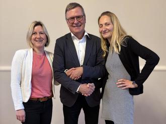 Hand in Hand für das Wohl unserer Stadt: Bürgermeister Holger Schulz mit den beiden neuen Amtsleiterinnen Nicole Müller (Amtsleiterin Kämmerei, links) und Sabine Harport (Amtsleiterin Bürgeramt, rechts). Bildrechte: Stadt Zwenkau