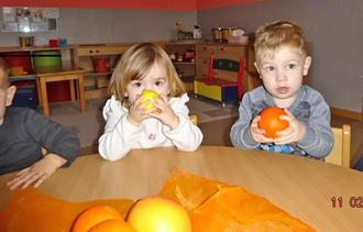 Im Januar stand „Gesundes Naschen“ auf dem Plan. Hafertaler und gesundes Müsli haben wir zubereitet und die Eltern unterstützten uns mit leckeren Gemüsesticks. „Zitrusfrüchte“ beschäftigten uns im Februar. Tolle Mimik konnten wir in den Gesichtern der Kinder beim Naschen von Zitrone, Grapefruit und Orangen beobachten. Das Wasser schmeckt uns jetzt mit ein paar Zitronenscheiben besser und die Experimente mit Zitronen verfolgten alle sehr aufmerksam.