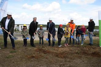 Baustart mit tatkräftiger Unterstützung der Jüngsten: Bürgermeister Holger Schulz und die Kinder des DPFA-Regenbogenhorts beim symbolischen Spatenstich gemeinsam mit Gerald Lehne (1. Beigeordneter des Landratsamts Leipzig), Norbert Hunger (Sachsen-Geschäftsleiter der Fröbel-Gruppe), Martin Arlt (Geschäftsführer des Frohburger Bauunternehmens Arlt) sowie Bauleiter Alexander Gaudlitz (Bauingenieur beim Zwickauer Planungsbüro HSP) Bildrechte: Stadt Zwenkau
