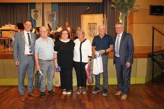 Bürgermeister Holger Schulz dankte den Nußlochern Frieder Hublitz, Cornelia Kempf, Helga Mészáros (Zwenkau), Jochen Link (von links), und Robert Rensch (fehlt auf Foto) gemeinsam mit Nußlochs Bürgermeister Joachim Förster (ganz links) für die ununterbrochene, treue Freundschaft untereinander. Diese fünf Genannten haben den Haupanteil an der Wiederzusammenführung der beiden Kommunen. Dafür ein RIESENGROSSES DANKESCHÖN!