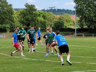 Im Max-Berk-Stadion fand ein kleines Freundschaftsspiel zwischen den jeweiligen Handballvereinen statt. Die Zwenkauer Germanen hatten mit einem Punkt Differenz gewonnen, fairerweise muss jedoch genannt werden, dass Spielerinnen und Spieler der SG Nußloch und der Stadtverwaltung unsere Mannschaft verstärkten. Doch auch hier dominierten trotz extremer Hitze Spaß und Kontaktfreudigkeit zwischen den Sportlern und der Jugend.