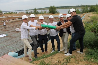 Benedikt Kahlstadt und Andreas Schmidt von der Sächsischen Seebad Zwenkau GmbH & Co. KG, Holger Schulz, Bürgermeister der Stadt Zwenkau, Roman Krabbes, Geschäftsführer der KRABBES & KRABBES Projektentwicklung GmbH & Co. KG, Marcel Müller-Rechenbach, Geschäftsführer der aiutanda Süd-Ost GmbH sowie Michael Hommel und Ingo Wilkerling von H+L Baustoffwerke GmbH versenkten gemeinsam symbolisch eine mit Zeitdokumenten gefüllte Kapsel (von links). An der Veranstaltung nahmen zahlreiche, weitere Projektbeteiligte teil.