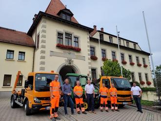 Am 24. August 2023 übernahmen Bürgermeister Holger Schulz und Mitarbeiter des Bauhofes unter der Leitung von Friedhelm Tauchnitz (l.) im Beisein von Bauamtsleiter Herrn Christian Haendel (2. v. l.), die Schlüssel für die beiden langersehnten, kommunalen Transportfahrzeuge von Franz Brunzel, Mitarbeiter für den Verkauf bei der Firma Möller Fahrzeugbau (r.) aus Thallwitz.