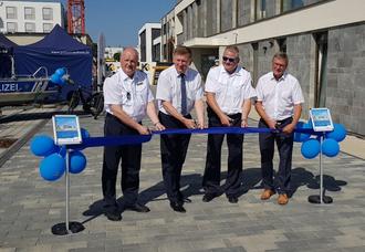 Bürgermeister Holger Schulz bei der Eröffnung des neuen Dienstgebäudes gemeinsam mit dem Staatssekretär des Sächsischen Innenministeriums Dr. Frank Pfeil, Polizeipräsident Peter Langer und dem kaufmännischen Geschäftsführer des Sächsischen Immobilien- und Baumanagements Oliver Gaber. Bildrechte: Stadt Zwenkau