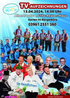 Die Fernsehaufzeichnungen zum Musikantenkrug finden am 13. April 2024 von 14.00 – 17.00 Uhr ebenfalls im Fritz-Reuter-Haus statt. Mit dabei sind neben den Randfichten, die Sängerin Sabine Denkinger, die Vier-Tore-Musikanten mit ihrer Blasmusik, die Sänger Danny Buller und Justin Winter, der Zauberer Frank, die Kindertanzgruppen Stormy Motion und Little Wave und das Duo Marion und Sabine. Als Moderatoren führen Jo & Josephine durchs Programm. Sie sind aber auch als Schlagerduo präsent.