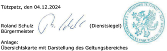 Die Gemeindevertretung der Gemeinde Tützpatz hat am 29.10.2024 in öffentlicher Sitzung den Bebauungsplan Nr. 7 „Wohnbebauung in Schossow“ der Gemeinde Tützpatz in der Fassung vom Oktober 2024 als Satzung beschlossen.