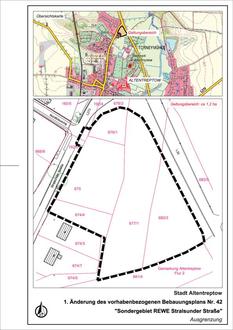 Zur Beteiligung der Öffentlichkeit gemäß § 3 Abs. 2 BauGB wird der Entwurf der 1. Änderung des vorhabenbezogenen Bebauungsplans Nr. 42,,Sondergebiet REWE Stralsunder Straße" der Stadt Altentreptow im vereinfachten Verfahren gemäß § 13 BauGB in der Fassung vom Oktober 2025 mit der Begründung