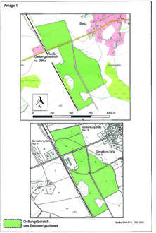 Der räumliche Geltungsbereich des Bebauungsplans beläuft sich auf eine Fläche von insgesamt ca. 39,5 ha und ist der in Anlage 1 beigefügten, flurstücksbezogenen Planzeichnung zu entnehmen. Er umfasst in der Gemarkung Seitz, Flur 3 die Flurstücke 1 und 2 (beide teilweise), in der Gemarkung Gültz, Flur 11 das Flurstück 21 sowie in der Gemarkung Gültz, Flur 12 die Flurstücke 4/1 (teilweise), 4/3, 6 (teilweise), 8 (teilweise), 25 (teilweise) und 27.